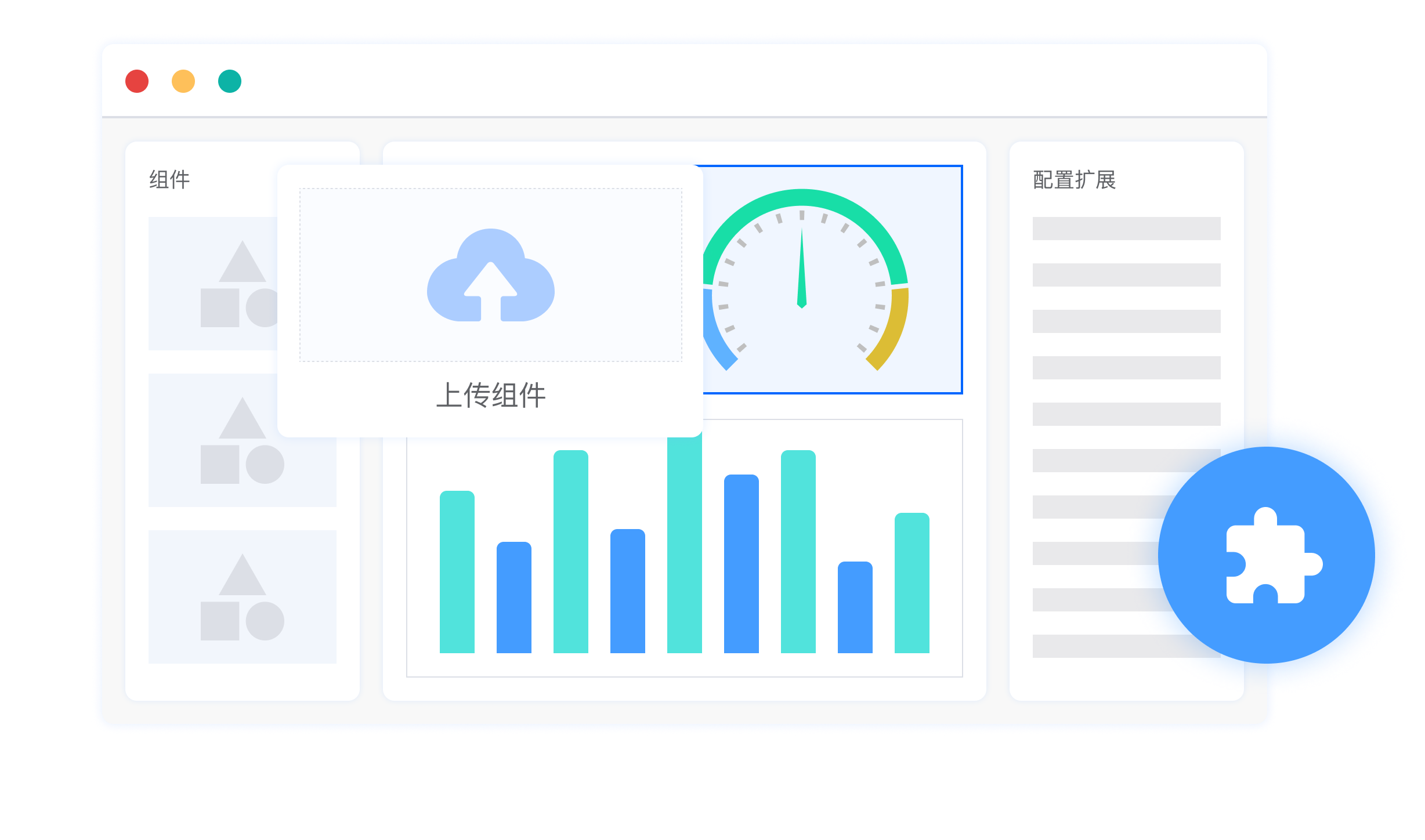 用户可根据需求扩展仪表盘,扩展组件或者扩展具体配置,亦或是上传自己开发的组件实现个性化展示。