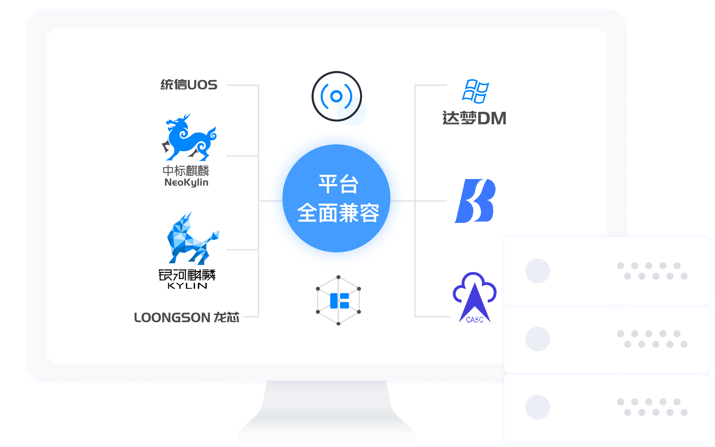 平台全面兼容信创体系,包括龙芯、鲲鹏等国产CPU芯片,中标麒麟、银河麒麟、UOS统信等国产操作系统,以及神通、达梦、人大金仓等国产数据库。